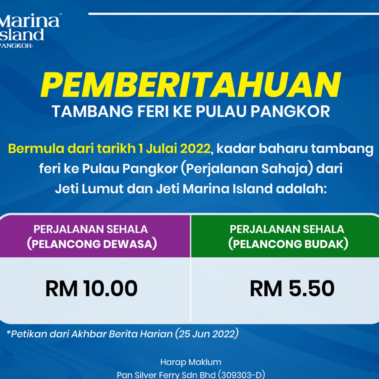 4 Hari x RM 8 RM 32. Sebelum ada Jeti Marina beberapa tahun dulu orang ramai lebih suka ke Pulau Pangkor dengan menaiki feri dari Jeti Lumut berbanding dari Teluk Batik. RM 1 Sejam Siang 6AM 1159PM RM 4 Malam 12 AM 559 AMKadar Maksimum RM 8 Sehari.